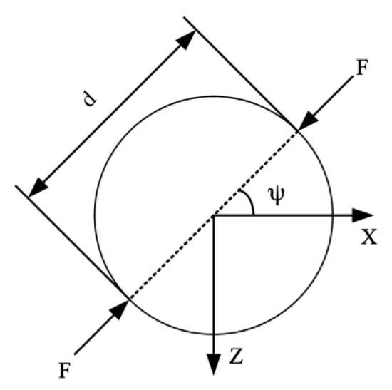 Figure 1 is a schematic diagram of a disc-type QCR subjected to two opposing radial forces. For a QCR with a defined angle of cut, the frequency shift generated by the external force is related to several parameters. The Ratajski force-frequency coefficient of a disc-type AT-cut quartz crystal resonator subjected to radial forces is defined as [13]: