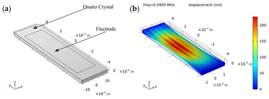 (a) Finite element model of AT-cut strip QCR; (b) Displacement of the QCR resonating in its resonant frequency of 6.0905 MHz.