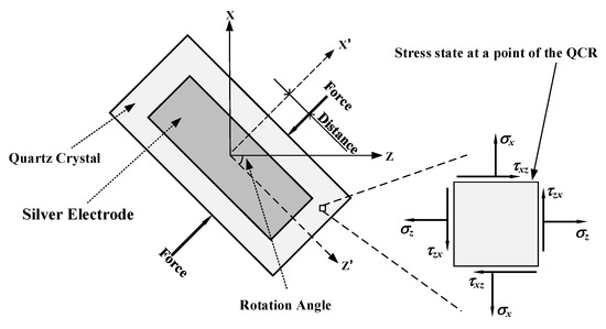 where is the value of the applied force, is the resonant frequency of the QCR, is the corresponding frequency shift caused by force, is the diameter of the crystal disk, and is the number of overtones. It can be seen that the force-frequency coefficient is a function of the cut angle, , and the azimuth, , of the applied force. The azimuth, , is marked in Figure 1, which is the angle between the X-axis of the QCR and the direction of the applied force.