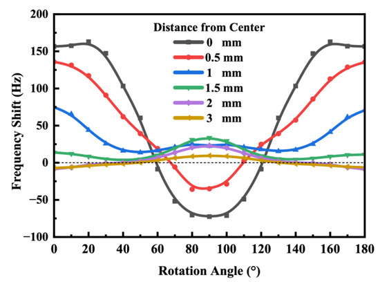 Evidently, the frequency shift was maximal when the force was applied along the X-axis at a distance of 0 mm. This is because the wave propagated in the X-direction, and the QCR’s primary vibrational direction aligned with the direction of the applied force at this position. And it is worth noting that the frequency shift was approximately maximized at a rotation angle of around 20° when the force-applying position was situated at a distance of 0 mm from the X-axis rather than at 0° as might be expected. This phenomenon could be attributed to the anisotropic nature of the quartz crystal. Furthermore, when the QCR was rotated to an angle of 60°, the resonant frequency remained almost constant under an applied force. Therefore, for optimal sensitivity when designing strip force sensors, the rotation angle of the QCR should be around 20°. And these simulation results were consistent with findings reported by other researchers regarding disc-type AT-cut QCRs [13,20].