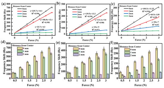 To ensure the accuracy of our experimental results, we measured the frequency responses of three QCRs at different magnitudes of force and at different force-applying distances from the center. We performed these measurements over a force range of 0 N to 3 N, with force increments of 0.5 N, and we repeated them three times. By these repetitive measurements, we were able to obtain reliable and consistent results for the force sensitivity of the QCRs. As shown in Figure 11, a least squares fit of the frequency shift was performed to obtain a linear plot of the force-frequency characteristics. Frequency shifts of all QCRs showed an excellent linear increase to the applied force, with almost all regression coefficients (R2) around 0.98. The experimental error analysis graphs in Figure 11 indicate a small standard deviation of the frequency shift, suggesting high stability of the experimental environment and system. The small range of data variability further confirms the reliability of the results.