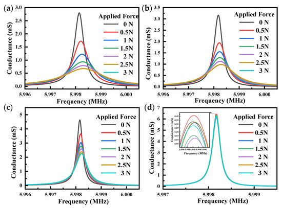 The conductance diagram of QCR-3 at different force-applying positions is shown in Figure 12, and the conductance diagrams of the other two sets of QCRs are similar. Its peak conductance and center frequency decreased with the increase in applied force, and the half-bandwidth was generally broadened with the increase in force. As shown in Figure 12a, the peak conductance decreased fastest with increasing applied force. Conversely, in Figure 12d, all curves were almost coincident, indicating that when the force was applied near the edge of the QCRs, the half bandwidth and peak conductance of the QCRs were almost constant. This result might be due to the fact that the edge of the QCR was very little affected by force, so the conductance did not change significantly as the force increased.
