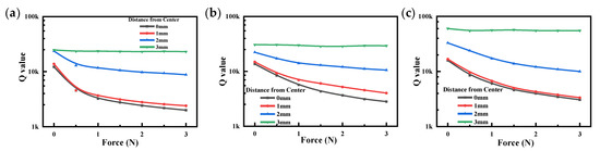 Figure 13 shows the Q value for all QCRs with different distances and force magnitudes. The results showed that the Q value decreased with the increase in the force magnitude. When the force was applied along the X-axis, i.e., the distance was 0 mm, the Q value decreased fastest, and with the increase in distance, the Q value decreased more slowly. The reason for this phenomenon is that the QCR was subjected to AC voltage during operation to produce thickness shear vibration. As the applied force increased, the amplitude of the vibration of the QCR decreased, and the friction loss of the QCR increased, resulting in a decrease in the stability of the QCR and a decrease in the Q value.