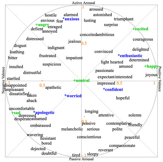 The JLCorpus https://www.kaggle.com/tli725/jl-corpus, (accessed on 1 January 2022) [21] contains a total of 2400 emotional speech sentences from 10 emotions (5 primary emotions-angry, excited, happy, neutral and sad; and 5 secondary emotions-anxious, apologetic, confident, enthusiastic and worried) spoken by two male (male1 and male2) and two female (female1 and female2) speakers of New Zealand English. The emotions in the JLCorpus are represented on a valence-arousal plane is shown in Figure 1. The valence indicates the pleasantness of the voice ranging from unpleasant (e.g., sad, fear) to pleasant (e.g., happy, hopeful). The arousal specifies the reaction level to stimuli ranging from inactive (e.g., sleepy, sad) to active (e.g., anger, surprise). Russel developed this model in a psychology study where Canadian participants categorised English stimulus words portraying moods, feelings, affect or emotions. Later, 80 more emotion words were superimposed on Russel’s model based on studies in German [22]. Russel’s circumplex model diagram, as used in this study and shown in Figure 1, was adapted from [23], which was adapted from Russel and Scherer’s work, but the positive valence was depicted by the right side of the x-axis (in contrast to Scherer’s study where it was on the left side.). A two-dimensional model was used (and not higher-dimension models) as representing the emotions on a plane facilitates their visualisation. The JLCorpus is used for this study.