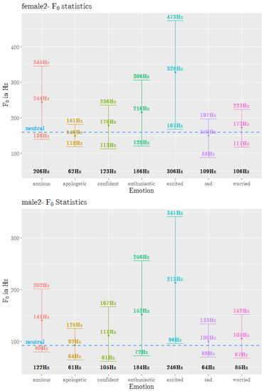 The track was extracted from the JLCorpus using the wrassp wrapper [26], an advanced speech signal processor library in R computing software [27]. The ksvF0 fundamental frequency estimation function was used with its default settings. The track was averaged at the sentence level to obtain the mean . The minimum, maximum and range of were calculated for every sentence. These were then averaged across all sentences to obtain the statistics for sad, excited and neutral and five secondary emotions, and this result is shown in Figure 2. The dot represents the mean , and the upper and lower bounds indicate the maximum and minimum values, respectively. The bold black number at the bottom of the graph is the range. The plotting was done using R’s ggplot [28]. Even though the frequency range for female2 and male2 speakers were different, the effect of emotions on had common trends. Among the secondary emotions, enthusiastic and anxious had the highest mean (high arousal emotions), with enthusiastic having the largest range (averaged across male2 and female2 speakers). Apologetic (low arousal emotion) had the lowest mean and range. Confident and worried fell in between the other three emotions that had more extreme values. Even though emotions such as apologetic, confident and worried had similar mean values, the range differentiated them. Confident in the fourth quadrant of the valence-arousal plane had a mean similar to neutral and worried; however, its range was higher than that of worried, which may have been an effect of its slightly higher arousal level or positive valence level. Interestingly, the primary emotion sad did not have the lowest mean value despite having the lowest valence level. A more detailed analysis of the fundamental frequency contour of secondary emotions was conducted by the authors and is reported in [29].