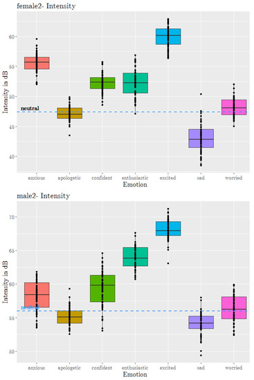 The mean intensity in decibels () was measured using the wrassp wrapper using the rmsana short-term root-mean-square amplitude analysis function with default settings. The intensity was averaged at the sentence level. Figure 3 shows boxplots for the intensity across sad, excited and neutral, and 5 secondary emotions plotted using R’s ggplot. Each point on the plot represents the mean intensity of a sentence. The dashed line is the mean intensity for neutral. It can be seen that emotions influenced the intensity very strongly. Distinct regions, often with little or no overlap, can be seen in the boxplots. In contrast to the values, the mean intensity values for the primary emotions excited and sad were clearly at the extremities. Among the secondary emotions, enthusiastic and anxious (high arousal) had the highest intensity, and worried and apologetic (low arousal) had the lowest. All high-arousal emotions (anxious, enthusiastic) were much above the neutral line and low-arousal emotions (apologetic, worried) were near or below it. Confident with arousal levels near neutral had intensity values slightly higher than neutral. This could be due to the positive valence of confident, and this claim needs to be investigated further. Moreover, confident had a slightly higher arousal than worried, resulting in higher mean intensity values.