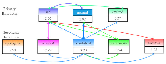 Finally, the speech rate in syllables per second was calculated by counting the number of syllables per sentence, and it was divided by the sentence duration [30]. The speech rate variations were not as pronounced as those of and the intensity due to the short duration of the sentences in the JLCorpus (as noted in [21]). An additional statistical analysis was conducted to understand the effect of emotions on speech rate. Figure 4 shows the statistical analysis results (from R) for eight emotions, with the value in the box representing the average speech rate for each emotion, where significantly different emotion pairs obtained from a pairwise t-test are marked by arrows. The emotion with the lowest average speech rate was the primary emotion sad (low arousal), and it was significantly different from all other emotions except apologetic, perhaps expectedly due to their similar valence and arousal levels. The primary emotion excited (high arousal) had the highest average speech rate, followed by anxious and enthusiastic. Confident showed a significant difference in speech rate from all other emotions. This could be a result of its unique position in the fourth quadrant (see Figure 1). Overall, the results suggested that with reducing levels of arousal from enthusiastic to apologetic, the speech rate reduced.