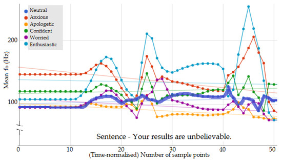 The results of the test are summarised as a collection of confusion matrices, one for each emotion pair shown in Table 4. The horizontal rows indicate the perceived emotions of the participants, and the vertical columns indicate the actual emotions. Each confusion matrix shows the perception accuracy in percentage (calculated by the number of correct choices of the emotion divided by the total number of sentences of that emotion as a percentage) for each of the emotion pairs. The highlighted percentage value in the table represents the cases where the participants perceived the actual emotion correctly. The Kappa statistics, (95% confidence interval, 0.813 to 0.818, ), showed strong inter-rater agreement, which means that there was consistency among the participants in differentiating the emotion pairs. Looking at the results, one can deduce that the most confusing emotion pairs were enthusiastic vs. anxious, confident vs. enthusiastic and apologetic vs. worried (which might be due to their closeness in the valence and arousal levels). Each participant evaluated each emotion pair 10 times, ensuring that each emotion pair was evaluated 290 times. Thus, it was reasonable to assume that the perception accuracy was much higher than chance. Overall, the average perception accuracy across all emotions was 87%. Comparing these results with past studies that modelled the contour for emotional speech synthesis such as [48] (reported 50% perception accuracy for expressions good news, bad news and question), Refs. [49,50] (reported 75% perception accuracy for happy, angry and neutral) and [51] (reported 65% perception accuracy for joy, sadness, anger and fear), the results obtained here were comparable to past studies. However, past studies did not report contour modelling for these secondary emotions. Hence, a direct comparison was not possible.