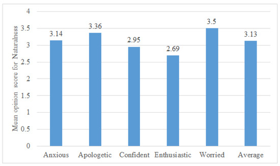 Figure 8 shows the mean opinion score of naturalness. The average score across all five emotions is also included. The perception of enthusiastic was found to be the least natural. However, all emotions’ naturalness rating was greater than 2.5, which indicated that the voice was not perceived as unnatural (based on the five naturalness levels described in [52]). The fact that even though the emotions were modelled on synthesised speech, the participants still felt that the emotional sentences were close to having a natural quality is a positive result.