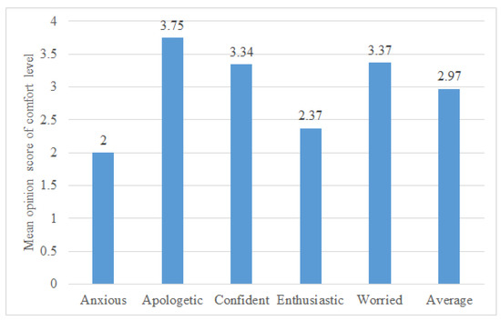 Figure 9 shows the mean opinion score of the comfort level perception. The average score across all five emotions is also included. All the emotions had a mean opinion score above two on the comfort level five-point scale, which indicated it was neutral, easy or very easy to listen to [52]. The perception of anxious was found to have the least comfort rating among all five emotions evaluated. For the emotional text-to-speech synthesis developed here, the voice synthesised here was expected to be suitable as, on average, participants found it comfortable to listen to (mean opinion score of 2.97).