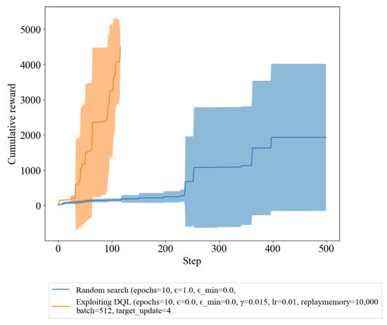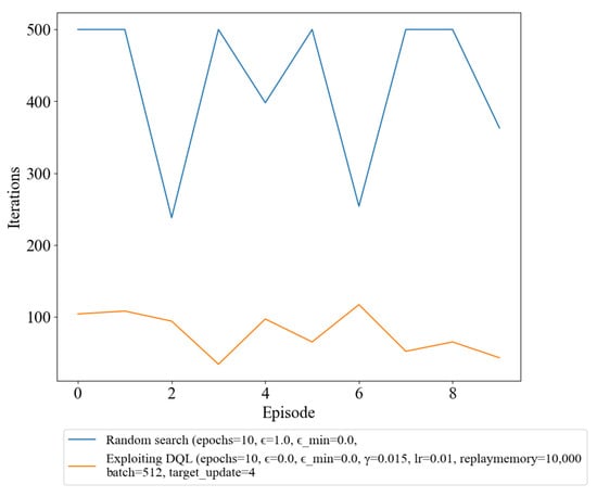 Additionally, we found that the iteration step comes to an end faster in the exploiting DQL policy compared to the random search policy, as shown in Figure 3. The results of the iteration step in a shorter period of time in the DQL policy indicate that it has the ability to identify and reach the terminal condition more efficiently. The ability to reach the terminal condition faster in the DQL policy is an important factor to consider, as it provides evidence that the training process has effectively improved the policy’s decision-making capabilities. In other words, the policy has learned to make the right decisions more quickly and with greater accuracy, resulting in a faster resolution of the episode.