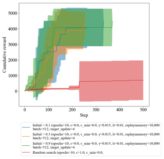 In Figure 4, we compared the results of cumulative rewards by varying the initial value of epsilon. The values used were 0.1, 0.3, and 0.9, which are blue, orange, and green, respectively. The objective of the agent was to reach the terminal condition while maximizing the reward within 500 iteration steps. The comparison of the results based on the epsilon value was conducted to determine the impact on the agent’s learning rate and decision-making abilities. The initial value of epsilon determines the exploration–exploitation trade-off in the reinforcement learning process. A higher initial value of epsilon would result in more exploration and less exploitation, while a lower initial value of epsilon would result in more exploitation and less exploration. The results show that a suitable initial value of epsilon is essential for fast convergence of the agent towards an optimal policy.