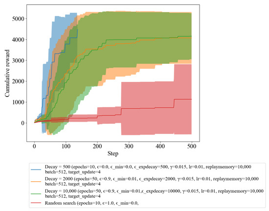 The statistics of the number of iteration steps taken by each epsilon decay to reach the terminal condition shown in Table 4. The epsilon decay of 500, 2000, and 10,000 takes an average of 67.90, 152.70, and 161.90 steps, respectively, while random search takes 472.2 steps. A lower epsilon decay resulted in a suboptimal policy, while a higher epsilon decay resulted in a poorly converged policy. Therefore, it is important to carefully choose the decay rate to ensure that the DQL algorithm is able to learn the optimal policy.