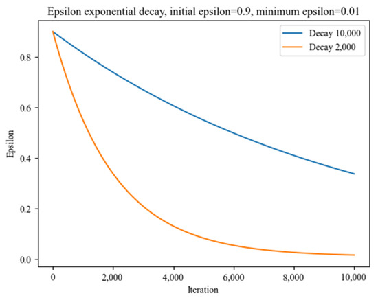 Regardless of the policy being followed, the Q-values are adjusted so that they eventually reach an optimal action-value function Q* [28]. One of the interesting features of Q-learning is that it can produce state–action pairs using various sampling techniques. A common sampling method is the ε-greedy action selection, as shown in Equation (2), where ε is a value in the range (0, 1].