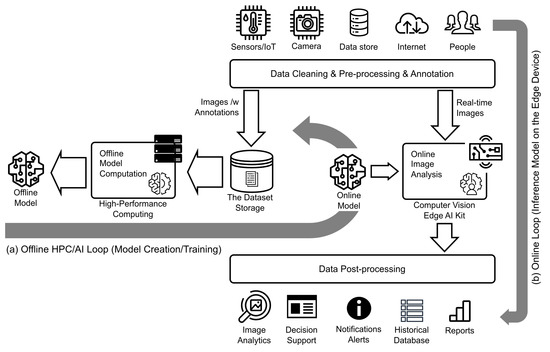 Conceptual approach for the development of computer vision for smart agriculture using HPC and deep learning: (a) offline HPC/AI loop: the dataset is used to train and refine prediction models using HPC resources, (b) online loop: images captured in the field in real-time processed by trained models ported to the edge AI device.