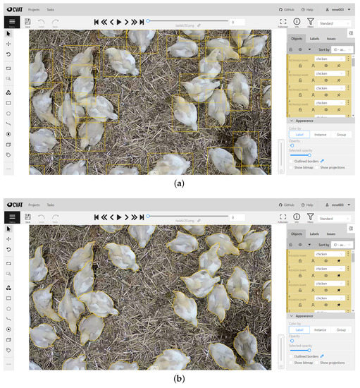 For training the prediction models for detecting chickens in images, about 4000 images were annotated. This dataset was expanded using the RoboFlow augmentation tool from 4000 images to around 9000 annotated images. Of these 9000 images, 7550 were used for training, 725 for validation, and 725 for model testing. As for the task of training the models for instance segmentation, about 1000 images were annotated. This dataset was also augmented with the help of RoboFlow tool, which resulted in the total number of 1660 images. For the training, this dataset was split into 1300 images for training, 180 for validation, and 180 for model testing. The augmentation process for both datasets assumed extending datasets by relying on operations of rotation, brightness change (from −15% to +15%), saturation (from −10% to +10%), and crop (maximum 10%). We should note that the annotation process for instance segmentation is much more labor intensive as it requires drawing polygons over each instance of chicken as opposed to just drawing a rectangle for the dataset used for training detection models. The use of CVAT tool for the annotation is depicted in Figure 3.