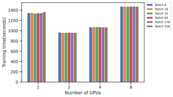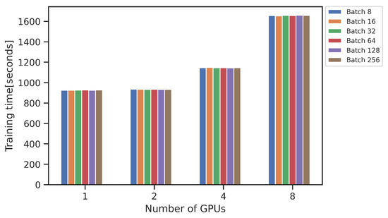 The training times and potential benefits of using multiple GPUs can be observed in Figure 4. A faster training time was achieved with 2 and 4 GPUs, while a slower training time took place when using 8 GPUs, in comparison to 1 GPU. The explanation for this could be found in the communication between several GPUs, gradient synchronization, and the size of the dataset [37].