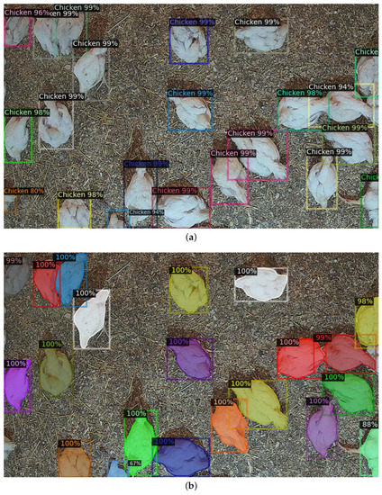 Deep learning algorithms are finding their place in image processing and computer vision applications. In recent years, the most mentioned neural network architecture for computer vision is convolutional neural networks (CNNs). However, there are new trends that increasingly highlight the transformer as state-of-the-art architecture, i.e., the visual transformer [6]. For analyzing and detecting objects in images there are two approaches that are often encountered. The first one is the You Only Look Once (YOLO) algorithm [7], and the second is the faster R-CNN algorithm [8]. A general observation is that YOLO is commonly used for real-time detection of objects, when the prediction model takes a very short time period to execute [7]. On the other hand, faster R-CNN is used in situations when precision is more important than the speed of the model, and when detecting smaller objects is important [8]. Another algorithm with the same purpose that offers a balance between prediction speed and model precision quality is single shot multibox detector [9]. The latest versions of the YOLO algorithm promise great speed and improved accuracy when compared to other algorithms. as shown in the comparative analysis given in [10]. As for object segmentation, the mask R-CNN neural network stands out as one of the most optimal [11]. In this research, different variants of faster R-CNN neural networks for object detection and Mask-RCNN for segmentation are analyzed. In [12], the authors provide a detailed analysis of different approaches to solving the segmentation problem. In [13], the authors deal with the implementation of the neural network LC-DenseFCN, focusing on the use of this neural network is to count chickens in an image. The network developed in this paper is based on the combination of two networks, LC-FCN and LC-ResFCN [14]. The chicken detection accuracy achieved by LC-DenseFCN is around 93.84% while the prediction speed is 9.27 frames per second (FPS). A comparison with YOLO [7], EfficientDet [15], and mask R-CNN [11] was provided and for the specific task of counting chickens in an image, and LC-DenseFCN proved to be the fastest and most accurate network. Authors in the [16] deal with the detection and counting of chickens in a cage-free environment. As the authors stated, they implemented the YOLOv5x-hens model based on the YOLOv5x model and reported that the accuracy of the YOLOv5x-hens model in recognizing chickens is about 95% in different environments (age, light intensity, observational angle). As a critical problem, the authors pointed out that the problem of this model is when it is used to detect younger chickens that are about one week old. This is especially problematic when they mix with other objects such as a feeder, but also when they are in a dense flock. In [17,18], the authors compare two key approaches that are used today for object detection, YOLO and Faster R-CNN algorithms. They reported that the advantage of the YOLO approach is the speed of prediction, and in newer versions, the accuracy of the YOLO algorithm may surpass the Faster-RCNN algorithm. A key benefit of the faster R-CNN approach is the more successful recognition of smaller objects. Authors in [18] stated that through YOLOv3, developers tried to overcome the problem of poor detection of smaller objects, but with some compromises, which led to worse recognition accuracy of larger objects when compared to the Faster R-CNN model. The authors in [18] decided to use Faster R-CNN because they had cameras placed at a higher height, thus they needed to detect smaller objects. In addition, the FPS parameter was not so important to them, which is one of the critical advantages of the YOLO algorithm. The paper [19] also describes how the faster R-CNN network can be used to detect chickens and monitor their movement on the farm. They state that they managed to get their method with average precision (AP) 93% accuracy in detecting chickens. The paper [20] uses the YOLOv5 algorithm to detect and track chickens on a farm, and they developed the ChickTrack model, which was tested in different environments. The authors stated that practical uses of the model can be challenging, and after the model testing was done in different environments, mean average precision (mAP) can have a lower value. The authors reported that the value for mAP is around 50%. Object detection and counting are also used in other areas of agriculture for different animals. The authors in [21] deal with counting piglets, and their key idea was to extend the counting CNN model [22]. They showed that they managed to reduce the mean average error (MAE) by a significant value compared to the counting CNN. The work [23] also deals with counting, but in this case, livestock is in the open. They show that mask R-CNN proved to be the best model compared to faster R-CNN, SSD, and YOLOv3. Another interesting paper is [24], which deals with the detection of dead chickens based on a model based on the YOLOv4 algorithm. It stated that the accuracy of this model is slightly above 97%. The paper [25] deals with the assessment of gender ratio in which they state that the accuracy of their model is almost 97%. In the research [26] authors deal with instance segmentation tasks for a goose. They stated that AP50 for both detection and segmentation is 96%. Finally, hyperparameter optimization using AutoML was discussed in [27].