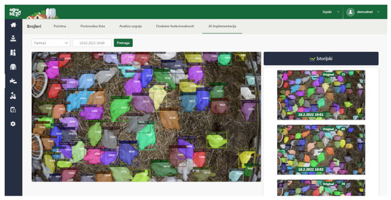 With deep learning algorithms, data is one of the key parameters influencing the quality of the developed model. The key activities to be carried out in this step are the collection, labeling, and processing of data so that it can be used to train deep learning models. For this experiment, the dataset is based on images of chickens extracted from the video material that was recorded in a couple of farms in Serbia and Montenegro. All of the images in the dataset were resized to 750 × 500 pixels and kept in JPG file format. The annotations were performed by several team members using the tool computer vision annotation tool (CVAT). This tool allows a quite comfortable annotation of images that can later be used for training and testing different prediction models. When exporting the annotated images, they are accompanied with annotations stored in JavaScript object notation (JSON) file format. These annotations follow the common objects in context (COCO) format [28]. With this format, the coordinates of the annotations on the image and the object categories are stored for each image.
