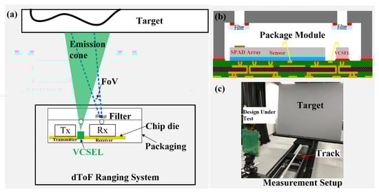 We designed the dToF ranging system as shown in Figure 1. The dToF ranging system is designed to achieve highly accurate depth measurements, which requires the co-optimization of the hardware and firmware. Figure 1a illustrates the working principle of the ranging system, Figure 1b illustrates the package module of the ranging system, and Figure 1c illustrates the measurement setup of the ranging system. The chip was packaged into a module for ranging, the resulting package created an emission cone from a vertical-cavity surface-emitting laser (VCSEL) light source of 940 nm, which reflected off a target to the SPADs array, and the SPADs array had an FoV in the package to receiver the echo photons. The ranging sensor measures the time it takes for the emitted VCSEL pulse to travel back to the sensor, which determines the target distance. In addition, a bandpass filter with a center wavelength of 940 nm was used to cut down the background noise. The sensor operates in two types of output modes: (1) histogram raw data mode: output raw data of histogram, and (2) ranging mode: output distance data of ranging.