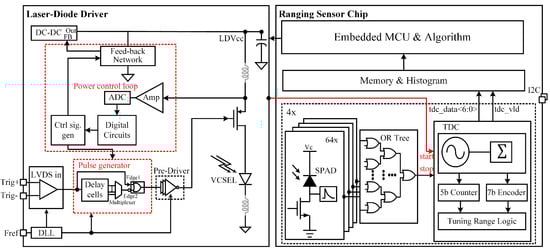 Various architectures have been proposed to achieve high accuracy ranging [,]. A basic approach to reduce the error of ranging is increasing the number of laser shots in the measurement, which can help to obtain a histogram distribution with a high signal-to-noise ratio (SNR), but lowers the frame rate []. A common approach to achieve high accuracy ranging is the use of scanning lasers, which illuminate only a single spot of the target scene at once []. In this technique, the field of view (FoV) of the laser source is much smaller compared with that of flash illumination, allowing a higher optical power, but scanning lasers are more expensive and more complex. Another approach is the use of the OR-Tree logic circuit to achieve pixel binning. The higher number of SPADs triggers the same time-to-digital converter (TDC), which helps improve SNR and reduces the error of ranging []. In this way, the higher the number of SPADs triggering the same TDC, the more timestamp information is lost.
