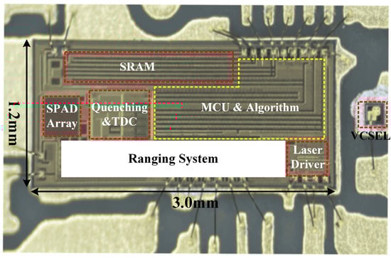The ranging sensor chip was fabricated in the 0.13 µm CMOS technology. The chip size is 1.2 mm × 3.0 mm. The chip consisted of a pulsed VCSEL driver and SPAD-based sensor, as shown in Figure 2. In the driver part, a programmable narrow pulse is generated on a chip via the pulse generator, and the first edge of the pulse (Edge1) comes directly from the external trigger, while the second edge (Edge2) is generated by properly delaying the trigger signal with a delay-cell line. The pulse delay is selected via the digital circuit. The output current of the driver is controlled by adjusting the laser driver voltage (LDVcc), which comes from a DC–DC regulator for which the feedback network is controlled by the digital circuit. A separate pulsed VCSEL driver was described by us in []. In the sensor part, a 16 × 16 SPADs array with quenching circuits was used, and each SPAD could be independently masked or binned to macro-pixel via OR Tree, four TDCs, a histogram builder that outputs the raw data of the histogram via I2C bus, and a firmware built-in MCU to implement the best profile-matched filter []. Figure 3 shows a micrograph of the ranging sensor chip.