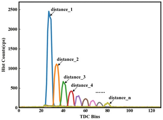 To find the best matched filter for our ranging system requires making our ranging system work in histogram raw data mode. A fully automated track was used to position the target at different distances for ranging, and we collected the raw data of the histogram at different distances. Figure 4 shows the raw data of the histogram at different distances. The laser ran at a repetition frequency of 1 MHz, with a 1 ns pulse width and an average power of 20 mW; the integration time of the ranging system was set to 30 ms; and the target reflectivity was 18%. We can see that in Figure 4, the SNR gradually decreases as the distance to the target object increases.