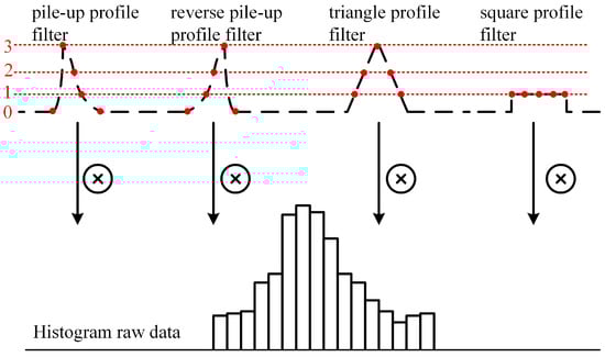We take the raw data of the histogram and process it through a set of matched filters to find a matched filter with the lowest range jitter. In this work, we define four types of profile filters (pile-up, reverse pile-up, triangle, and square) to process the raw histogram data. The processing of the different types of matched filters is shown in Figure 5. The filter operation is performed by convolving the histogram with the filter kernel, , and the histogram processing method can be evaluated by using Equation (1) as follows.