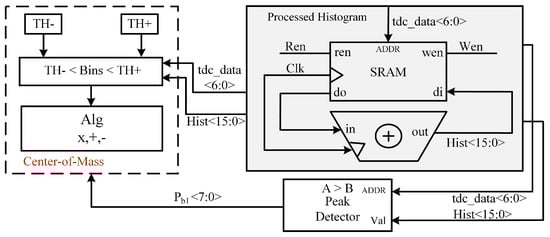 We started with a single-point ranging calculation in order to characterize the precision of the different profile-matched filters in this ranging system. We defined precision as the standard deviation of the ranging system, and collected 200 sets of histogram data for each target distance. After the filtering process, the standard deviations of different filters at different distances are calculated using a CoM algorithm []. Figure 6 shows the implementation of the CoM algorithm. The processed histogram data output 7 bits of and 16 bits of , the as the histogram bins value, and the as the histogram count value of each histogram bin. The output values of the processed histogram are input into a peak detector circuit, and used to calculate the maximum peak bin as . We set a window of with the width of full-width at half-maximum (FWHM) optical pulses. FWHM represents the FWHM of VCSEL. At this point, we have to map the 7-bit processed histogram data to the incoming TDC bin values (tdc_data), which have passed through the window such that Equation (2) holds. The low threshold value of the window is expressed by Equation (3), and the high threshold value of the window is expressed by Equation (4).