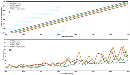 The results of 200 measurements with different profile-matched filters: (a) Mean distance. (b) Standard deviation.