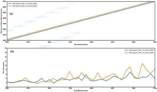 The precision results of different widths of laser pulse are compared with the ranging system. Figure 9a shows the mean distance of 200 measurements with different laser pulse widths; for a laser pulse of 1 ns, the measured mean distance is closer to the real distance. Figure 9b shows the standard deviation of 200 measurements with different lengths of square profile-matched filter kernels. The depth precision is less than 6 mm over the whole range for a 1 ns laser pulse width, and the depth precision is less than 12 mm over the whole range for a 2 ns laser pulse width. With a 1 ns laser pulse width, the square profile filter has the least jitter of ranging. The narrower the pulse width of the laser, the more concentrated the distribution of the photon signals in the laser pulse, and the lower the jitter of ranging.