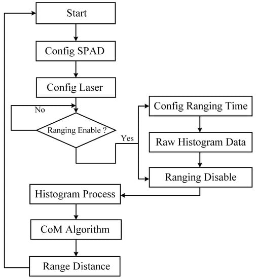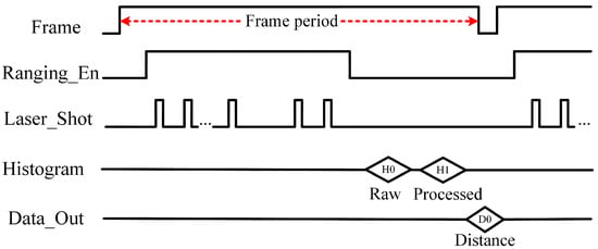 The timing diagram of the readout circuit is shown in Figure 11. At the beginning of each frame, the bias voltage circuit regulates the SPADs cathode voltage to a predefined value, preparing for effective signal detection. A starts the VCSEL emit laser pulses according the initial configuration to generate the timestamps. After the ranging period, the timestamps are collected as a histogram. The best profile-matched filter kernel is implemented in MCU to process the histogram, and a corresponding CoM algorithm is used for distance calculation []. The ranging distance is read out in serial-transmission mode.