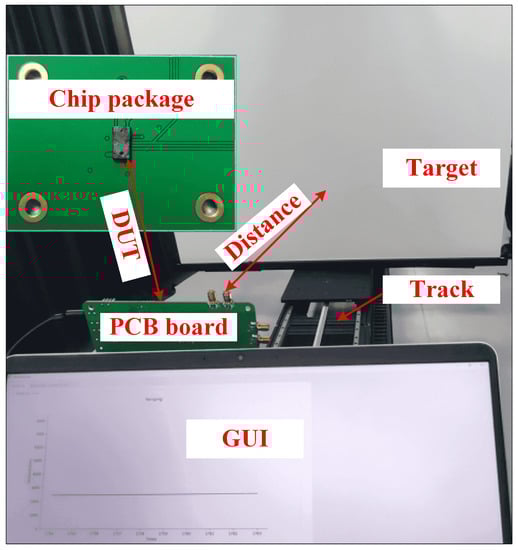 We started with a single-point range measurement in order to characterize the precision of the dToF ranging system. Figure 12 shows the setup for ranging measurements: a fully automated track that can position the target at different distances, a test-printed circuit board (PCB) board, and a GUI interface for displaying the measured distances. The VCSEL and the sensor are packaged into one module without any focusing lens. The laser is powered with 20 mW on average, 1 ns pulse width runs are carried out at a repetition frequency of 1 MHz, and the ranging sensor runs at 100 frames per second. Photons reflected from targets with different reflectivity are received by the ranging sensor. The distance from the target to the ranging sensor is calculated and the standard deviation can be obtained by measuring each distance 200 times.