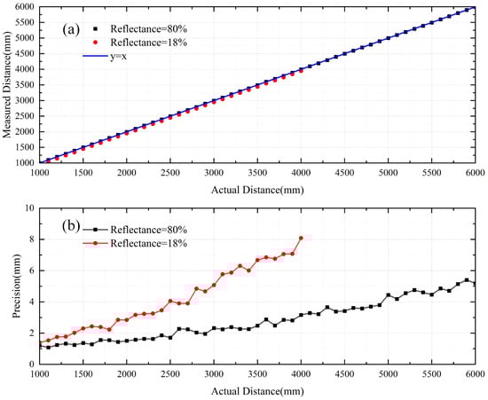 The linearity and depth precision vs. the actual distance larger than 1000 mm with different target reflectivity under indoor light conditions. (a) Linearity. (b) Depth precision.