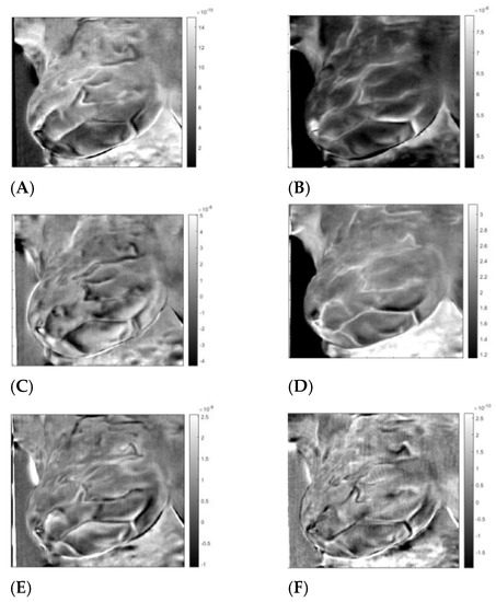 Thermal images of patient “T281”; right breast after VWT and PCA. Images A to F are individuzal PCA vectors converted to images (A–F).