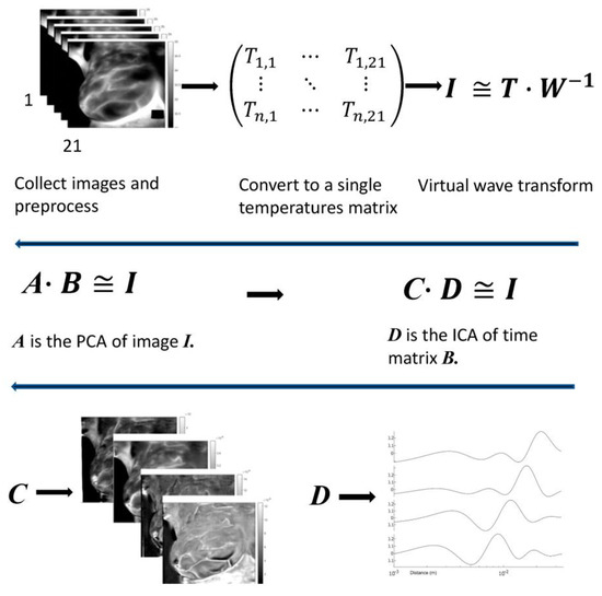 We borrow techniques used in thermal NDE. The 21 individual frames (20 time-lapse and a static one) are converted into 21 vectors, becoming a single matrix of 21 columns. We keep a tab on the correspondence between vectors and image indices. We use two mathematical tools to analyze the data, VWT (Appendix A) and matrix factorization (Appendix B). By applying VWT, we perform time focusing on the images. It is equivalent to a matrix factorization I = T M where I is the original image, and the time matrix T is W of Equation (A8). The image matrix M becomes a virtual wave with wave-like properties; each column represents an image at a different depth. The transformation is simple as it requires only matrix multiplication. The matrix W has no information unless we want to reconstruct the original data. Performing VWT also rejects images that do not follow diffusion propagation in response to the cooling. As the transformation is ill-posed, time focusing is imperfect, and images in matrix M still overlap. We remedy the overlap in two stages; in the first step, we use PCA. PCA factors the converted matrix based on similarities between images; it cannot separate similar-looking images that arrive at different times. Next, we separate the images based on their arrival time by applying ICA to the resulting time matrix. The process uses three alternate matrix factorizations; time-based and image-based, followed by a time-based. We give more details in the examples.