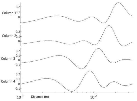 Traces 1:4 after application of ICA to the time matrix of Figure 3 on log time scale with the sequence ti = 0.025 × 2(i − 100)/20.