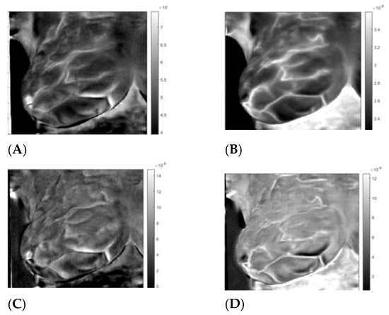 Healthy right breast of patient “T281.” Images 1A to 1D after application of the inverse ICA transform. (A,B) are images of thermal reflection, while (C,D) are images of vasoconstriction.