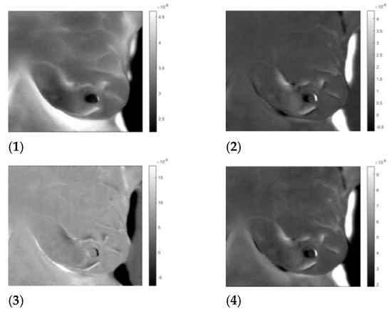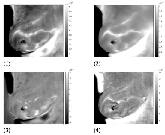 “Healthy” left breast of patient #T285. Images 1 to 4 after application of the inverse ICA transform. (1) and (2) are images of thermal reflection, while (3) and (4) are images of vasoconstriction.
