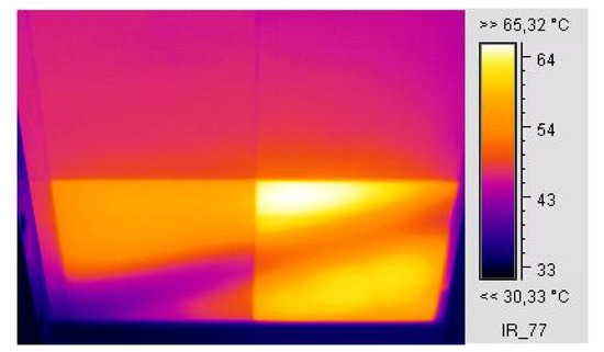 The EVA browning in one of the cells of the c-Si M55 module created an effect of partial shading, leading to a current drop of 0.25 A in the operating conditions, as shown in the I–V characteristic (Figure 4a), which in turn led to the affected cell operating at a higher temperature by about 34 °C from the neighbouring unaffected cells of the module, as shown in the IR thermography (Figure 4b). The module I–V characteristic was measured using I–V curve analyser PV-KLA (Ingenieurbüro Mencke & Tegtmeyer GmbH, Hameln, Germany) and the IR thermography was captured using an IR camera IC085LV (TROTEC GmbH, Heinsberg, Germany). Equation (1b), for n = 18 and Vd = 0.6 V and considering (hc + hr)f +(hc + hr)b about 20 W/m2K at the conditions of the experiment vw = 2.1 m/s, IT = 760 W/m2, and Ta = 30.9 °C, predicted the temperature of the affected cell Tpv = 74 °C, which is in agreement with the IR thermography (Figure 4b) showing the affected cell reaching temperatures between 74–79 °C. This explains that the PV temperature pattern developed was due to the current mismatch caused by the cell exhibiting EVA browning.