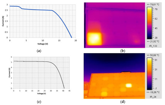 (a) The I–V characteristic and (b) IR thermography of an M55 module, operating for 24 years, with EVA browning in the bottom-left-corner cell. The affected cell exhibits increased temperature of around 34 °C higher than neighbouring cells in the module. (c) I–V curve of a brand-new c-Si BIO175 module at IT = 899 W/m2, (d) IR image of the same module during operation.