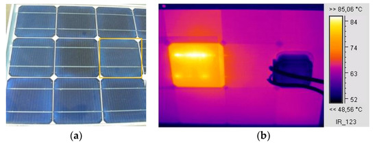 A case where EVA degradation led to corrosion at the busbars is shown in Figure 5a,b. The affected cell appeared upon close visual inspection to have mild EVA and ARC degradation similar to neighbouring cells. The IR image (Figure 5b) revealed hotspots at the busbars, which may have been due to corrosion, with a temperature 20 °C higher than that of neighbouring cells.