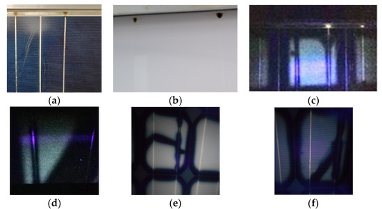 The UVF image reveals the extent of EVA degradation. The intensity of the fluorescence from the EVA degradation pattern was proportional to the number of chromophores due to the dissociation of EVA molecules by the UV of the SRD, as also supported by Figure 2b,d–f. Signs of EVA browning appeared in pc-Si ES modules 124 Wp under natural ageing conditions at SRD > 10 MWh/m2, as shown in Figure 2b. The EVA degradation patterns in small c-Si modules follow the cell geometry. In large modules, the patterns may have non-symmetric shapes, as in Figure 6d, where the bleached area was diagonal due to the stress loads that bent the module. Figure 6e,f show UVF images of c-Si SW80 cells that suffered from non-visible cracks.