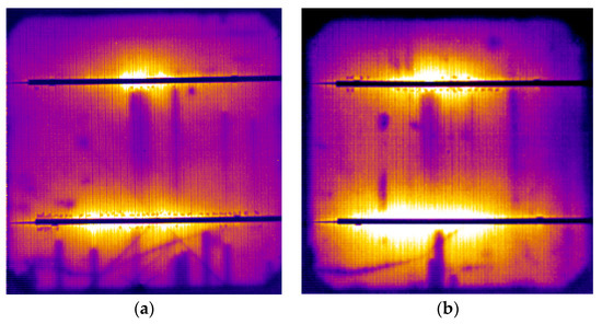 Delamination of the EVA/cell interface around the busbar was observed in several cells of the M55 modules operating for 18 and 24 years, such as the ones shown in Figure 3c,d. EL tests using the short-wave infrared (SWIR) camera Goldeye-P008 (Allied Vision Technologies, Germany) were performed on a M55 module with the module forward biased at 19.5 V–19.8 V (Voc = 21.7 V). The resulting EL images (Figure 7a,b) revealed darker contrast in the delaminated spots around the busbar, whereas the surrounding area was EL bright due to e−+hole recombination. Delamination of the EVA/cell interface caused a small decrease in the current proportional to the delaminated area, a small increase in the Rs, and a decrease in the Rsh. The effect can be quantified through I–V analysis at the cell level. As δRs is usually very small, the Tc profile along the delaminated area was very small, too, and the IR thermography did not detect any essential Tc pattern. The delamination spots formed during the years of operation expanded in the x–y dimension, whereas new spots appeared whose rate depended on the SRD and the level of the Tc developed. High-resolution EL imaging enabled the investigation of the impact of delamination at the EVA/cell interface. Other defects, such as broken fingers and shunts, were also visible. The combination of a wide range of degradation effects that can be detected through EL imaging gives rise to the need for a combination with other techniques for the quantification of the degradation caused by the individual defects.