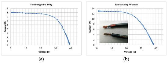 The I–V characteristics of two identical PV generators (a) at a fixed angle and (b) sun-tracking. The photo in (b) shows corrosion in one lead of the cable.
