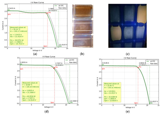 The aforementioned gradual drop of δIsc = 0.15 A between 5–10 V (Figure 9a) corresponded to Rsh and to a shunt diode due to current mismatch attributed to the EVA/cell-interface delamination spots and to the two cells exhibiting different degrees of browning (Figure 9c). This current mismatch caused a low Tc pattern when operating in field conditions, which slightly reduced Voc and Vm. In addition, the cracks, small breaks, and EVA/cell-interface delamination shown in Figure 9b and disclosed by the EL analysis below contributed to δIm, as well as an increase of δRs = 0.85 (from Table 2) − 0.30 (manufacturer) = 0.55 Ω and a decrease in Rsh to be identified by EL imaging and analysis of the deviations of electrical parameters. Both δRs and δIm = −0.70 A caused a deviation δVm from the nominal value Vm.