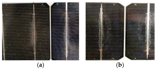 SM55 no3 showed no EVA browning, and its I–V characteristic is presented in Figure 9e. The module was subject to natural ageing. The EVA/cell-interface delamination was present in all cells, as shown in Figure 10a,b, but it was not as extended as in module no2. Indeed, in Table 2, module no3 showed the least increase in Rs compared to no1 and no2 and the smallest Pm degradation of 16.8%. The deviation of its electrical parameters was estimated as δVoc = 0.62 V, δVm = 1.41 V, δIsc = 0.347 A, δIm = 0.30 A, and δRs = 0.134 Ω. Equation (7) predicted δVm = 0.94 V, which is much lower than the experimentally determined one, although recombination and delamination effects were taken into account. In this case, the cause of the deviation was the numerous cracks and the grid-line interruptions revealed through EL imaging (Section 3.2.1), whose effect may not be included in Equation (7). This remark allows for the prediction of breaks and cracks in the cells when the δVm estimated by Equation (7) deviates significantly from the measured δVm provided that Rsh is not significantly degraded.