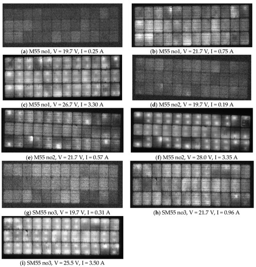 Figure 12. EL images of M55 (a–c) module no1, (d–f) module no2, and (g–i) module no3. The bias V and the allowed I are shown for each case. - The dark contrasts in the sequence of EL images captured from low bias V to V = Voc faded away with the increase in the bias V, and this implies that those cells or areas of cells had a lower Rsh. This is shown in Figure 12a,b,d,e and Figure 12g,h. Such dark contrasts do not appear in healthy cells.