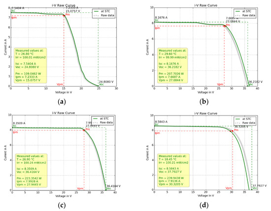 (a) The I–V of pc-Si ODT no1, extremely deformed due to organic-film deposition; (b) the I–V of the same module recovered from degradation; (c) the I–V of ODT module no2 of the same type as no1, (d) the I–V of the same type of module no3.