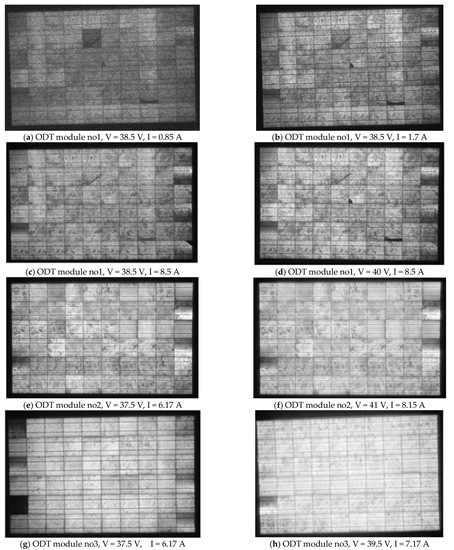 The EL images of ODT no1 (Figure 14a–d) revealed multiple broken cells, at position (x,y): (6,3), (8,5), (10,6), which remained dark at all bias V. In cell (5,2), a tick sign remained at all bias V, which demonstrates a crack. In addition, periphery cells whose dark parts remained even at higher bias-V values were revealed. This implies a δRs, and therefore the Rs was expected to be higher and the Rsh lower than in module ODT no2, as confirmed in Table 3, with no broken parts, as shown in the EL image (Figure 14f). The contrast in the dark parts in some periphery cells and in cell (5,2) decreased when the bias V increased. This implies that those dark regions were due to Rsh. Figure 14e–h correspond to ODT no2 and no3 and exhibited similar effects of dark regions, which reflects issues related to the manufacturing process. ODT no3 had lower Rs, as there was only one dark area in the EL image (Figure 14g,h) that remained relatively dark at high bias V. This is confirmed in Table 3. Indeed, Rsh of no3 was lower than of no1 and no2, as expected, because the cells whose dark contrast decreased with V were more numerous than in the other two modules (Figure 14a–f).